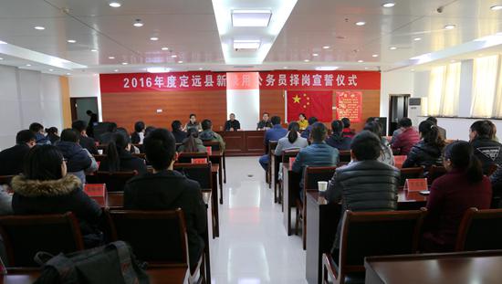 11月28日上午,定远县举行2016年度新录用公务员择岗宣誓仪式。县委组织部常务副部长、县委非公工委书记孟庆报代表县委组织部表示祝贺,他要求大家增强岗位意识、责任意识,以誓词为自己的座右铭,不忘初心,不辱使命,在今后的工作中砥砺前行,在平凡的岗位上作出不平凡的业绩。(县委组织部 陆凤伦)
